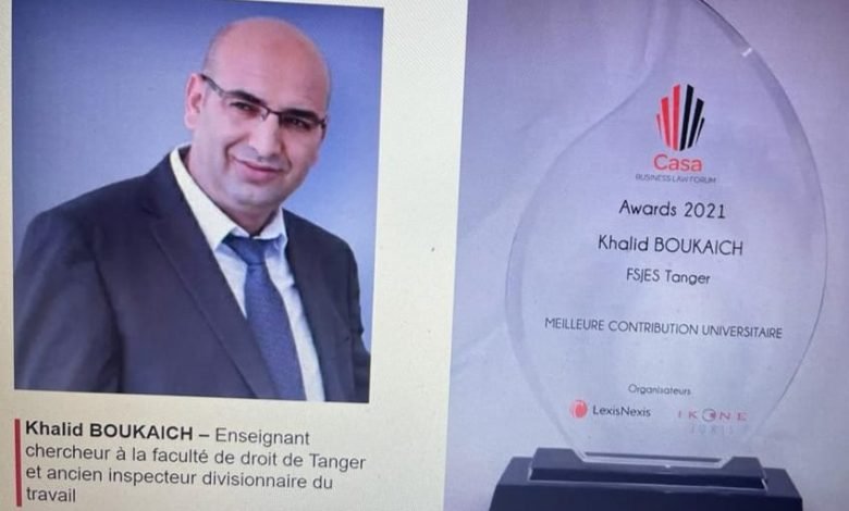 فاز خالد بوقيش الباحث والأستاذ الجامعي بكلية الحقوق بطنجة بجائزة أحسن مشاركة علمية جامعية في حقل القانون خلال سنة 2021 الصادرة عن دار النشر lexis Nexis، وجاء هذا التتويج بناءً على مجموعة من المقالات التي نشرها، كما يأتي هذا التتويج أيضا في إطار المجهودات البحثية والعلمية التي يقوم بها هذا الباحث على مستوى كلية الحقوق بطنجة، وكذلك تثمينا للمجهودات التي يقوم بها هذا الباحث ومساهمته القيمة بالعديد من الدراسات والأبحاث في مجال تخصصه (القانون الإجتماعي) وفي مجال القانون الخاص بصفة عامة.