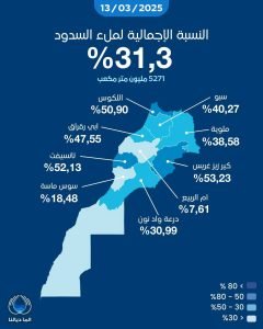 وبلغت نسبة حقينة السدود الوطنية، إلى حدود يومه الخميس، 31.31 في المائة، أي ما يعادل 5 مليارات و272 مليون متر مكعب.