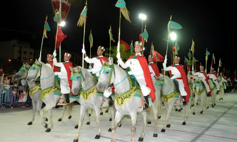 وقد انطلق الطواف البهيج من الإقامة الملكية، مرورا بشارع للا نزهة، وصولا إلى ساحة الكورنيش، حيث قدمت تشكيلات من مشاة الحرس الملكي، وموسيق ييه وخيالته وحملة المشاعل، لوحات استعراضية مبهرة، على أنغام النشيد الوطني والمقطوعات العسكرية والأناشيد الوطنية التي خلدت وأرخ ت لأمجاد المملكة المغربية الشريفة.