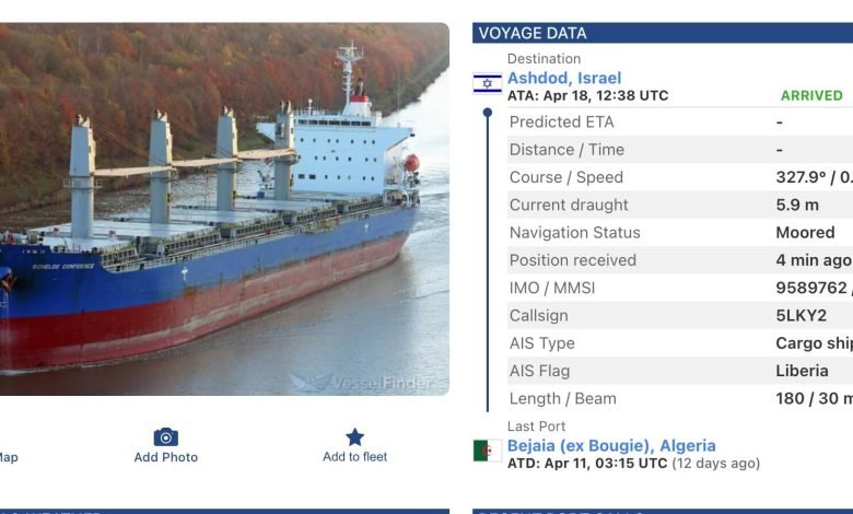 وبحسب موقعي “Vissel Finder” و”Marine traffic” المتخصصين في تتبع تحركات السفن الدولية للشحن، فإن السفينة المذكورة “كابتن كريستوس” توقفت في ميناء بجاية الجزائري في 11 أبريل الجاري، لتكمل بعدها الرحلة نحو ميناء أشدود الإسرائيلي.
