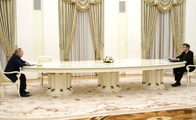 أثار لقاء الرئيس الفرنسي إيمانويل ماكرون، ونظيره الروسي فلاديمير بوتين، في موسكو، يوم الإثنين 7 فبراير 2022، ردود أفعال واسعة على شبكات التواصل، حيث استغرب الجميع طريقة جلوس ماكرون وبوتين على جانبي الطاولة، حيث اعتبر البعض طريقة الجلوس برمزها إلى حجم الفجوة بين روسيا والغرب، الذي تلعب فرنسا دور الوساطة بينه وبين موسكو بسبب الأزمة الأوكرانية.